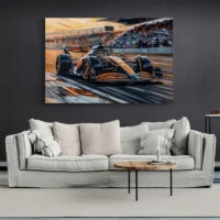 Ce Tableau Voiture Mclaren Formule montre une voiture de Formule 1 McLaren en gros plan, livrée orange et noire, avec l’aileron arrière bien marqué. On distingue les jantes sombres, les pneus rainurés et des détails techniques sur la carrosserie. Le fond reste sombre et met le véhicule en valeur, avec un léger flou qui suggère la vitesse. On ressent une énergie immédiate, brute, presque mécanique.