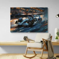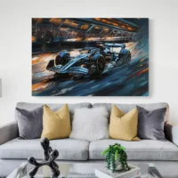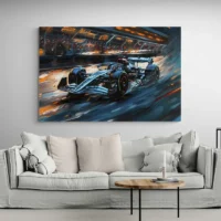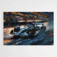 On ressent l'énergie de la piste, la concentration et la rapidité. Cette toile conviendra aux fans d'automobile, aux collectionneurs et à ceux qui aiment l'image technique. Le contraste entre l'argenté de la carrosserie et le vert clair crée un rendu moderne et affirmé. Elle apporte de l'énergie au mur, vraiment.