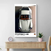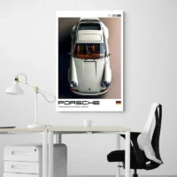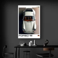 Ce Tableau Voiture Porsche montre une Porsche en trois-quarts, posée comme sur une photo de collection. On voit des phares ronds bien nets, des jantes larges à plusieurs branches et des reflets qui soulignent la courbe de la carrosserie. Le rétroviseur se détache sur la ligne du toit, la calandre reste visible et le fond reste sobre, clair et légèrement flouté.
