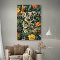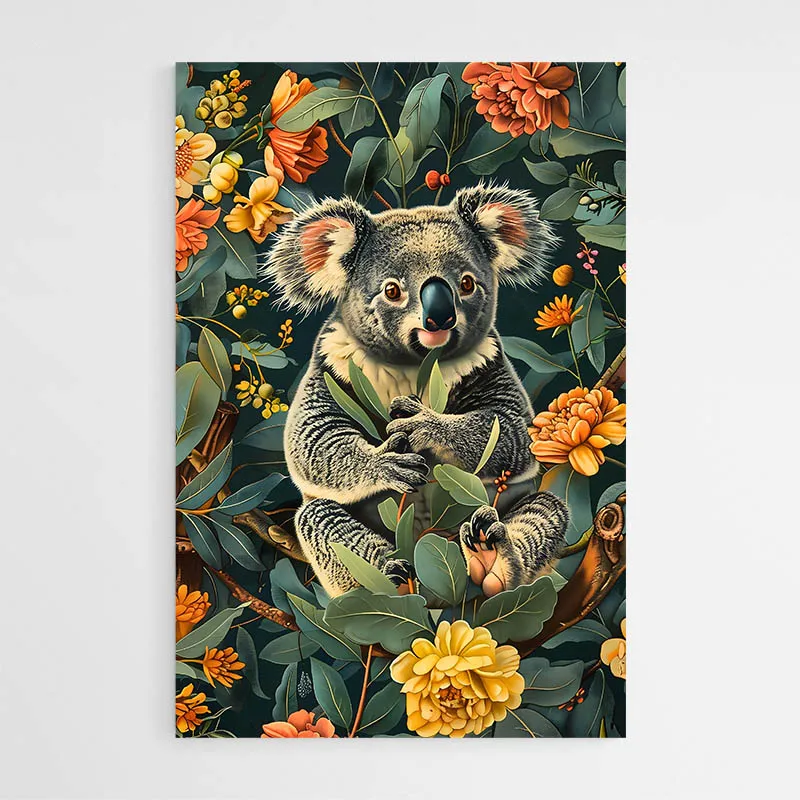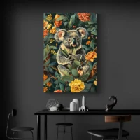 On ressent une ambiance classique et végétale. Le contraste entre le pelage gris du koala et les motifs verts attire le regard. Ce tableau plaira aux amateurs d'illustration animalière et aux personnes qui aiment les décors raffinés et chaleureux. Il donne une présence délicate au mur et rassure, oui, rassure un peu.