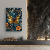 Le Tableau William Morris Papillon Dore montre un décor végétal dense et ordonné. On remarque un grand papillon doré posé sur un fond vert profond, des feuilles en arabesque qui s’entrelacent, et des fleurs stylisées de teinte claire. Les courbes répétées créent un rythme visible, avec des tiges sinueuses et des petits boutons floraux qui ponctuent la surface. L’ensemble reste précis, délicat, très ornemental.