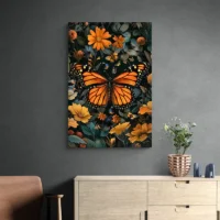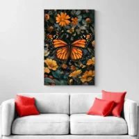 Ce Tableau William Morris Papillon Orange montre un grand papillon orange posé sur un fond à motifs végétaux. On voit des feuilles stylisées en vert profond, des fleurs aux tons crème et ocre, et des lignes fines qui structurent le motif répétitif. L’équilibre entre l’orange du papillon et les verts crée un contraste très présent. L’ensemble rappelle les tapisseries classiques, avec une allure soignée et très décorative.
