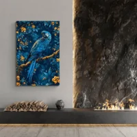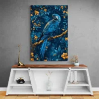 Ce Tableau William Morris Perroquet Bleu montre un perroquet bleu posé au milieu d’un feuillage dense. On voit un plumage finement dessiné, des fleurs stylisées qui se répètent et des feuilles en arabesques. Les tons dominants sont le bleu et le vert, avec des nuances plus claires qui apportent du relief. Le rendu rappelle les tapisseries anciennes, riche et très décoratif, et on adore, on adore ce côté graphique.