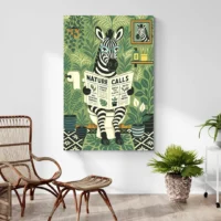 Le Tableau zebre WC montre un gros plan de zèbre, très net et frontal. On voit des rayures noires et blanches bien marquées, un œil sombre qui fixe, un museau texturé et des oreilles dressées. Le fond reste clair et épuré, ce qui fait ressortir le pelage. On sent tout de suite la force du contraste, et oui, ça marque l'espace.