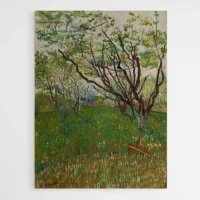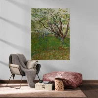 Cette toile, Verger en Fleur - Van Gogh, capte tout de suite l’œil avec ses arbres couverts de petites fleurs blanches et roses. On voit des troncs bruns tordus, des branches fines qui se croisent et un sol gazonné aux verts variés. Le ciel clair apporte une grande luminosité. Les touches de peinture restent visibles, épaisses par endroits, et donnent du mouvement.